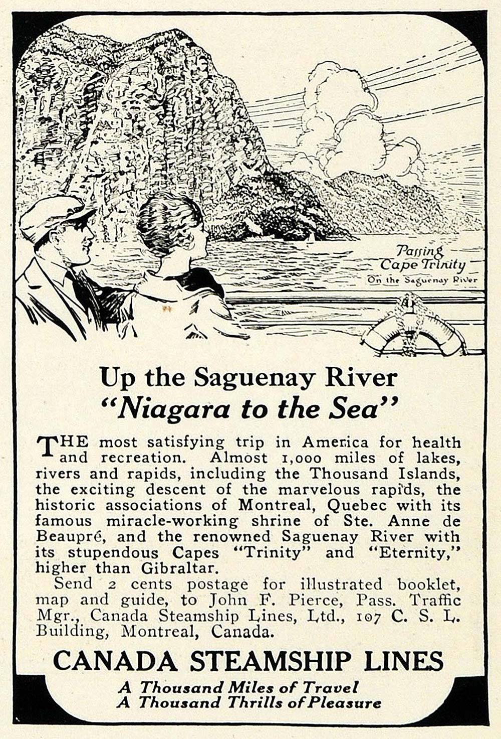 This is an original 1921 black and white print ad for the Canada Steamship Lines, Ltd. located at 107 C. S. L., Montreal, Canada.