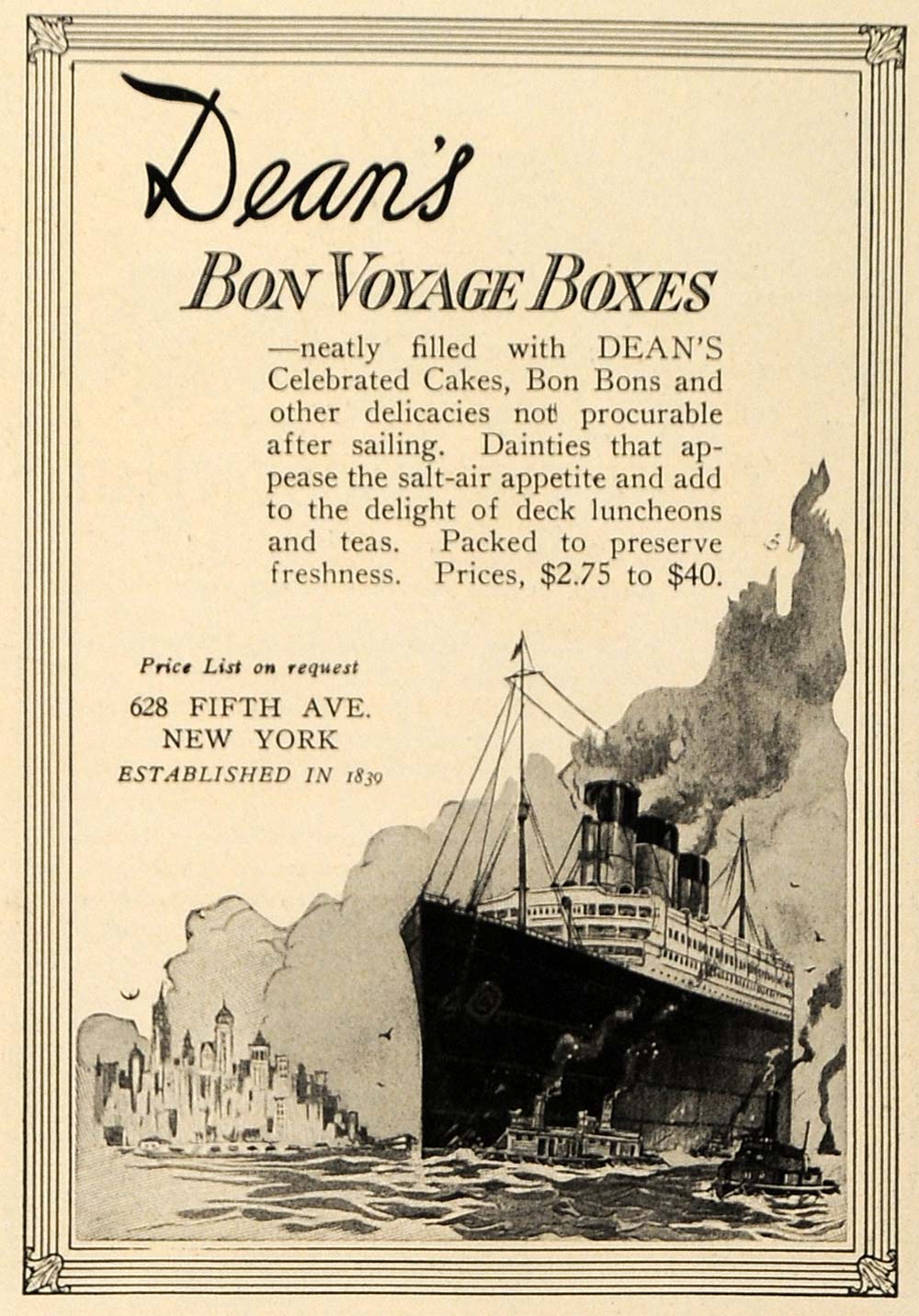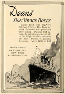 This is an original 1921 black and white print ad for Dean's Bon Voyage Boxes, filled with cakes, bon bons and other delicious delicacies.