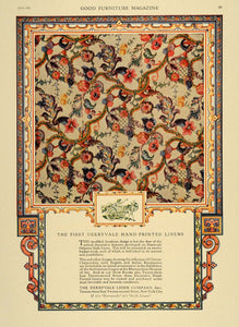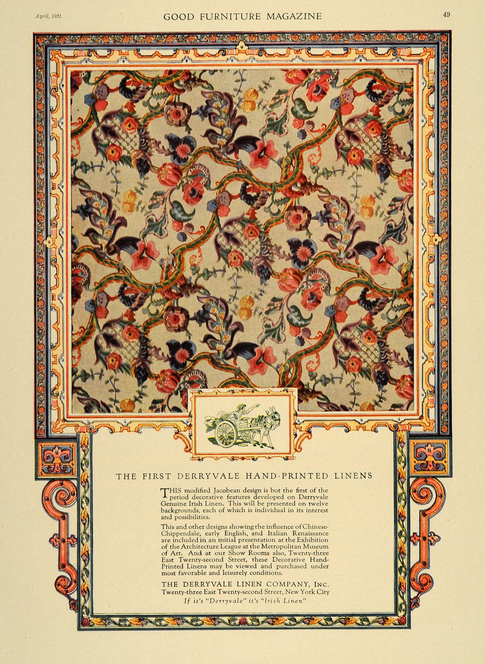 This is an excellent original 1921 color print ad for the Derryvale Hand-Printed Linens from Derryvale Linen Company, Incorporation located in New York.