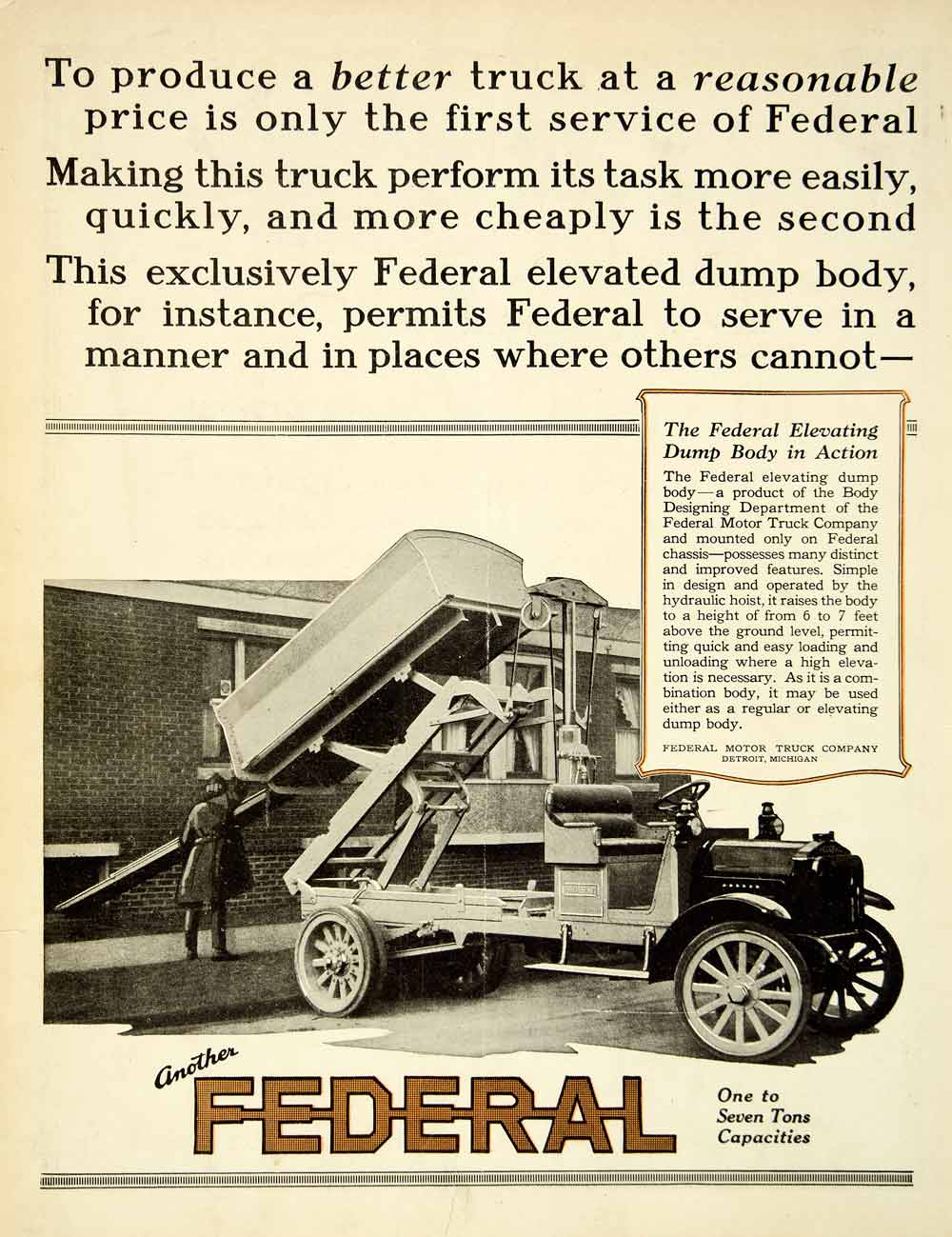 This is an original 1921 two-color print ad for an early dump truck from the Federal Motor Truck Company of Detroit, Michigan.