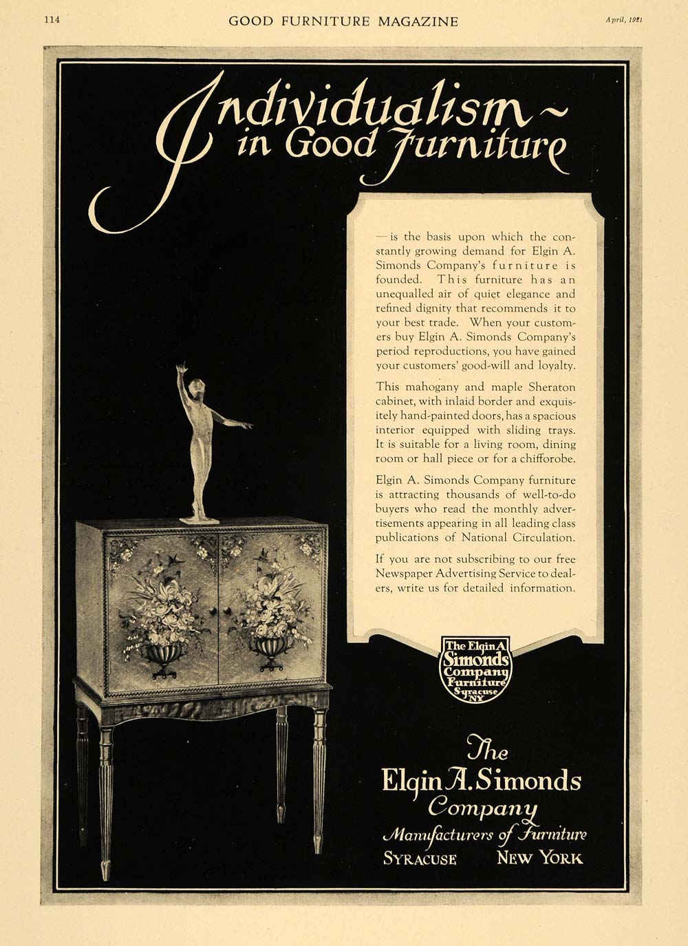This is an original 1921 black and white print ad for the Period Furniture featuring the Mahogany and maple Sheraton Cabinet with inlaid border and exquisitely hand-painted doors from Elgin A. Simonds Company located in Syracuse, New York.