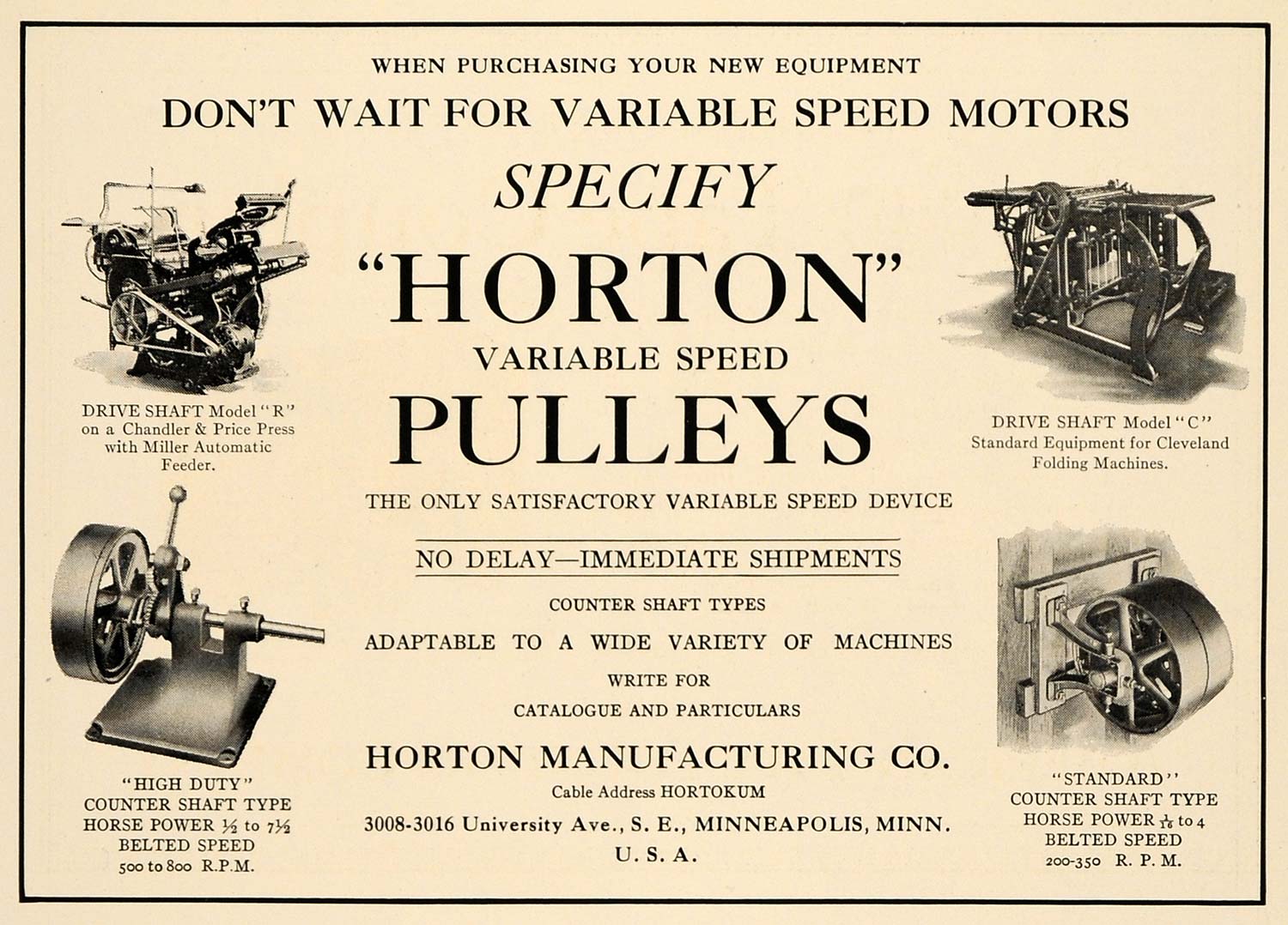 This is an original 1921 black and white print ad for the Drive Shaft Model C and R, the Standard and the High Duty Horton Pulleys from the Horton Manufacturing Co. located in Minneapolis, Minnesota.