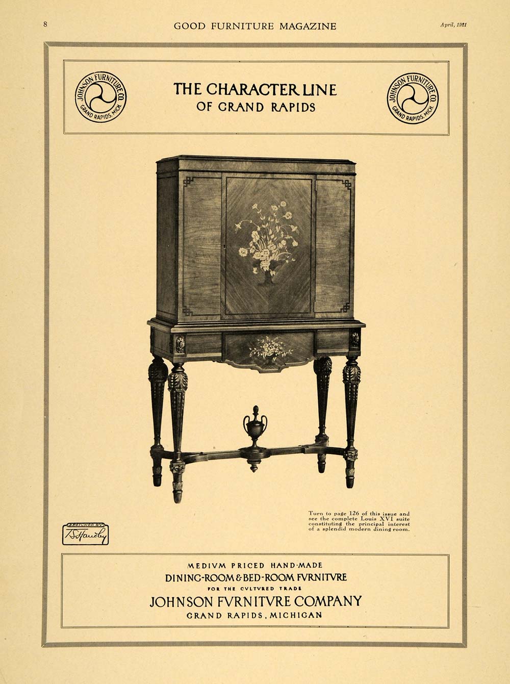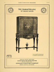 This is an original 1921 black and white print ad promoting the Louis XVI Cabinet from Johnson Furniture Company located in Grand Rapids, Michigan.
