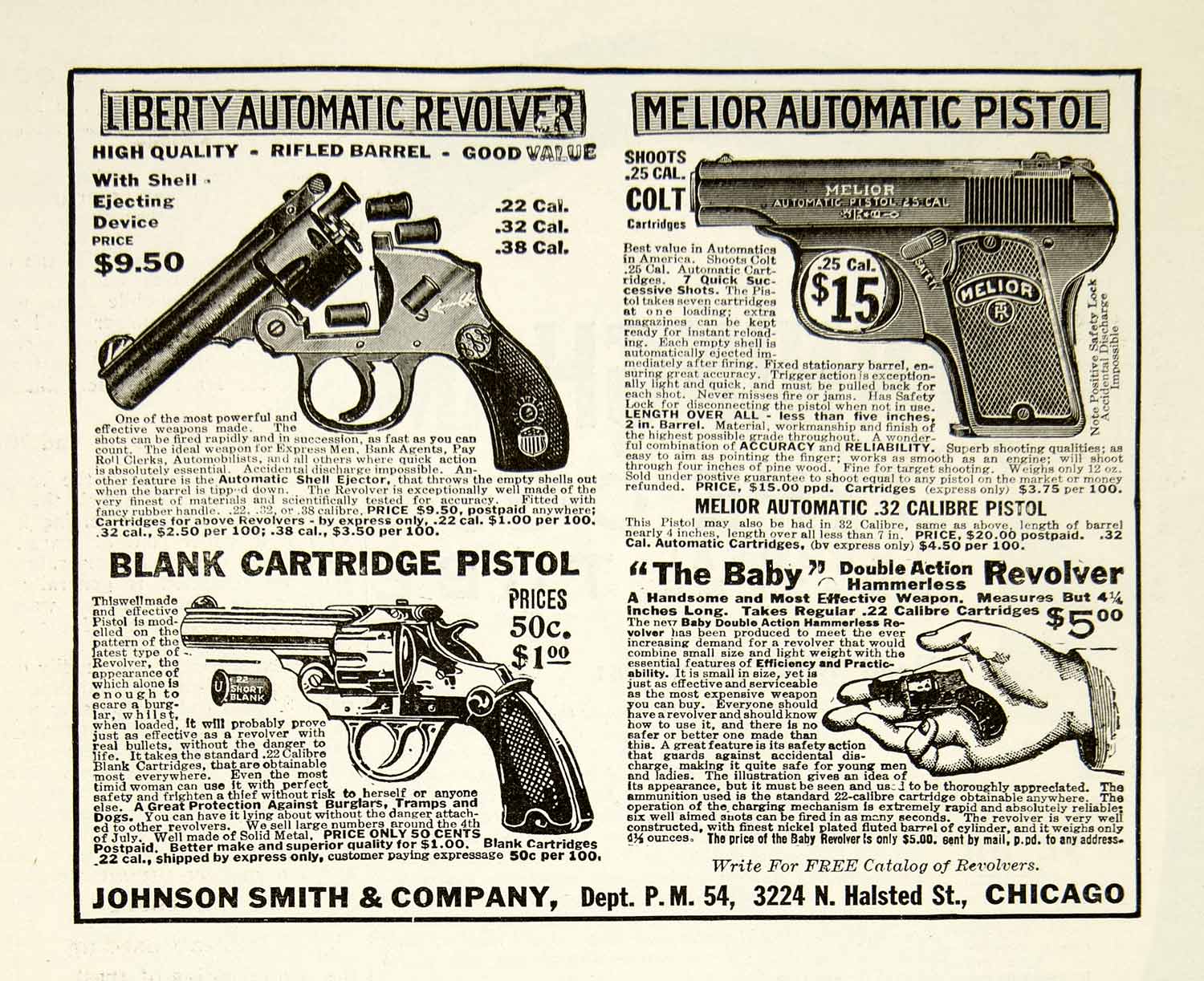 Keywords specific to this image: Vintage Advertising, Liberty Automatic Revolver, Melior Automatic Pistol, Blank Cartridge Pistol, The Baby Revolver