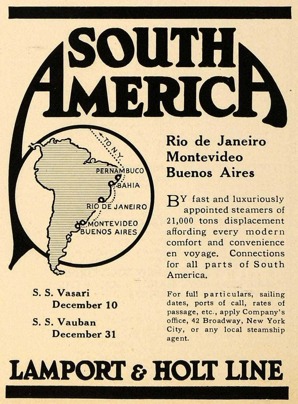 This is an original 1921 black and white print ad for traveling around South America on the S. S. Vasari and S. S. Vauban by Lamport & Holt Line.