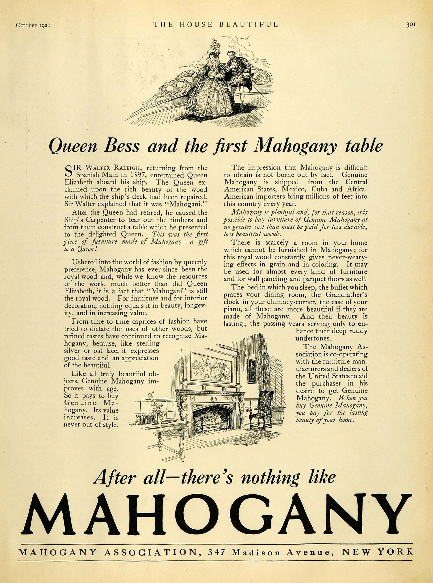 This is an original 1921 black and white print ad for the Mahogany Association located at 347 Madison Avenue, New York City.