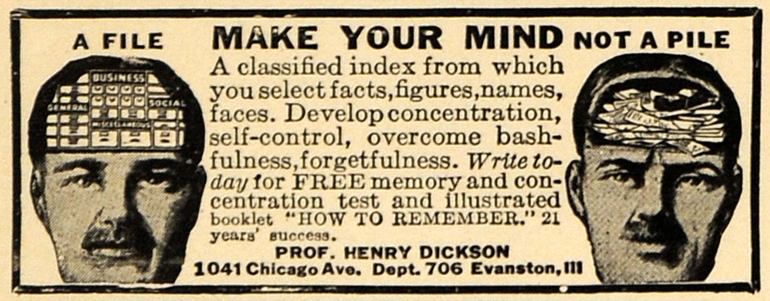 This is an original 1921 black and white print ad for Professor Henry Dickson's booklet on how to achieve a stronger memory.