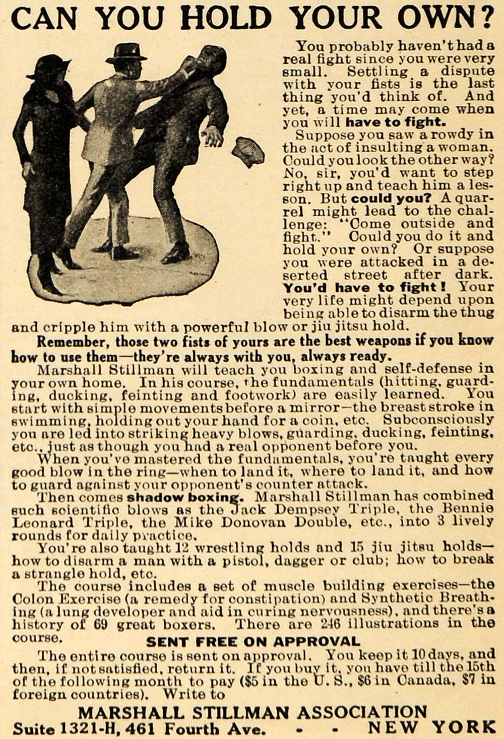 This is an original 1921 black and white print ad for the Marshall Stillman Association, located at Suite 1321-H at 461 Fourth Avenue in New York. This ad features Marshall Stillman's self defense and fighting teachings and techniques.