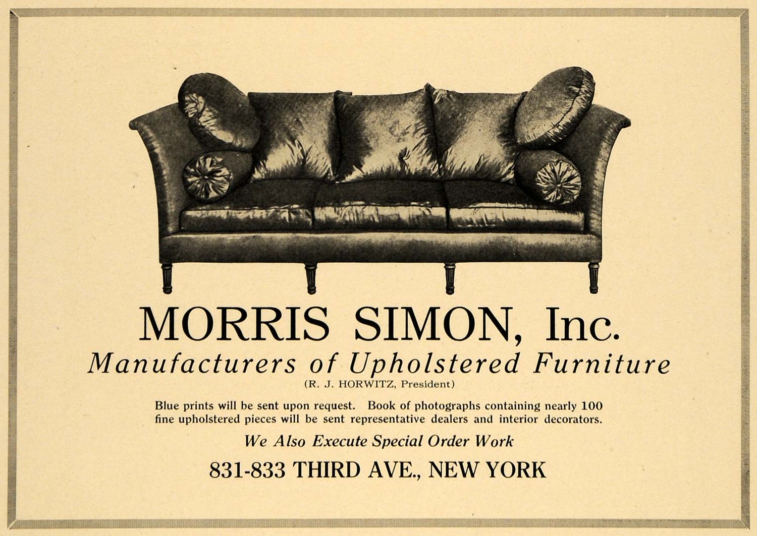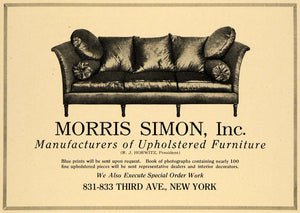 This is an original 1921 black and white print ad for the Morris Simon, Incorporation, manufacturers of Upholstered Furniture located at 831-833 Third Avenue, New York.