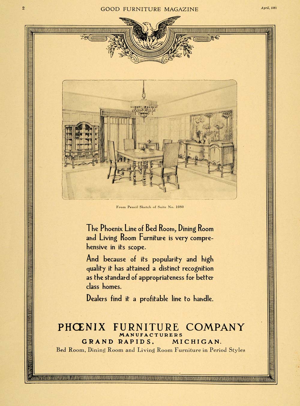 This is an original 1921 black and white print ad for the Phoenix Furniture Company, manufacturers of Bedroom, Dining Room and Living Room furniture in Period Styles located in Grand Rapids, Michigan.
