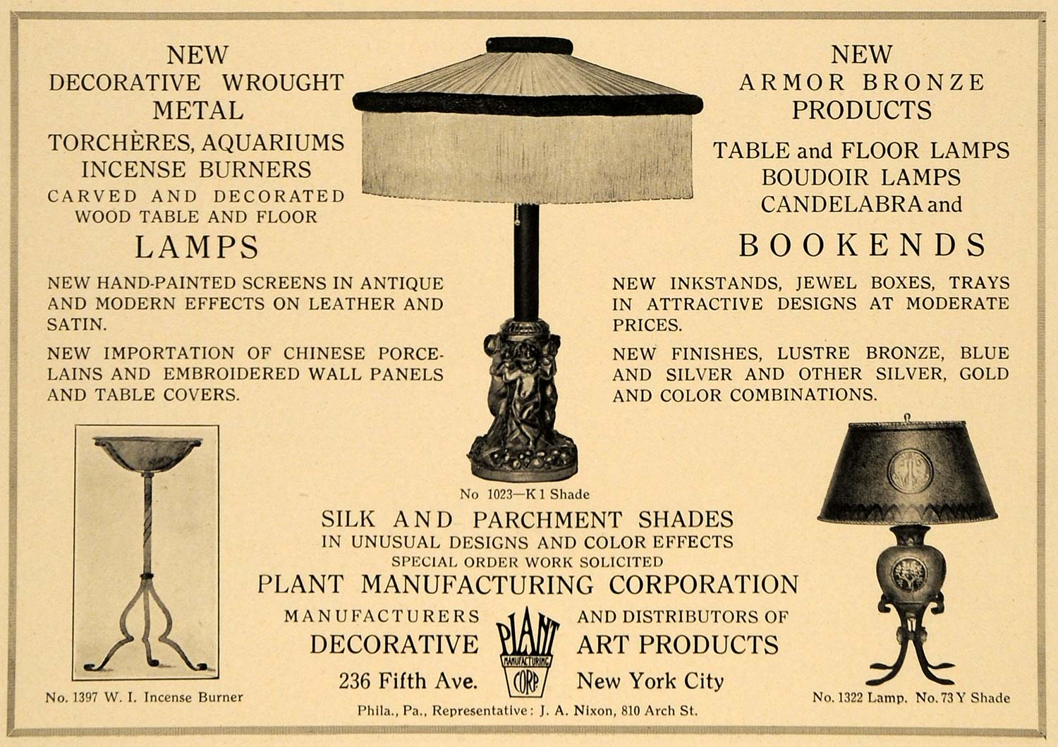 This is an original 1921 black and white print ad for the Decorative Wrought Metal Incense Burners, Carved Wood Table and Floor Lamps, Embroided Wall Panels, Table Covers, Armor Bronze Products, Art Products, Bookends, Silk and Parchment Shades from Plant Manufacturing Corporation located at 236 Fifth Avenue, New York.