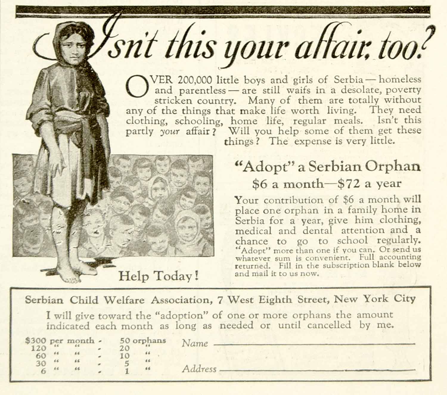 This is an original 1921 black and white print ad encouraging the financial support of Serbian orphans, innocent casualties of the fighting in World War I, from the Serbian Child Welfare Association, 7 West Eighth Street, New York City.