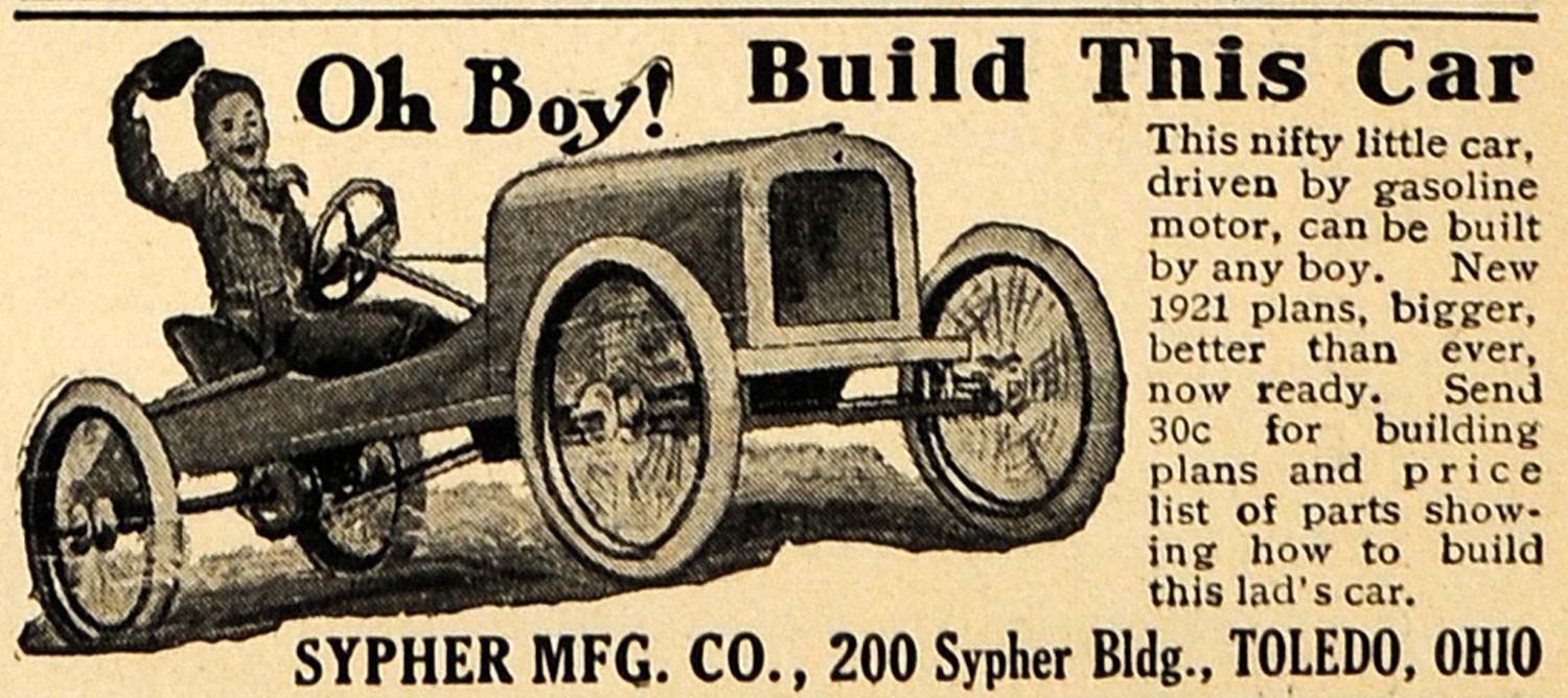 This is a tiny original 1921 black and white print ad for the gasoline motor car, built by boys for boys, a product by Sypher Manufacturing Company, located at 200 Sypher Building in Toledo, Ohio.