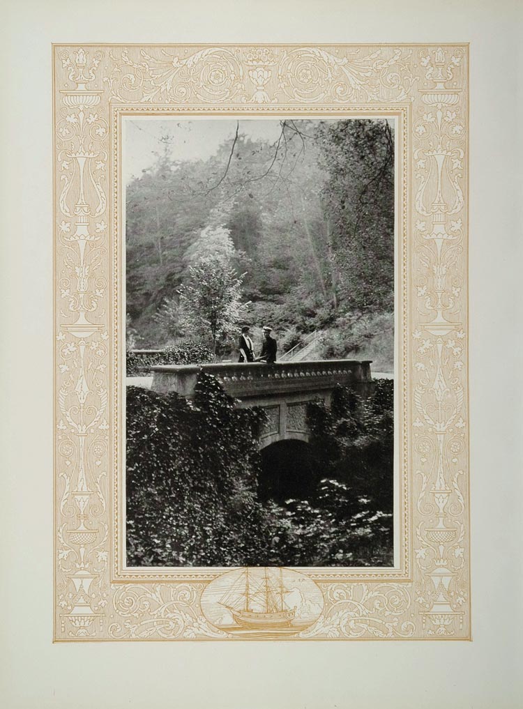 This is an original 1921 halftone print of a U. S. Naval (officer?) talking with a young woman--his sweetheart(?) on a bridge. This print has a lovely border drawn by artist Franklin Booth (artist initials in print, bottom center).
