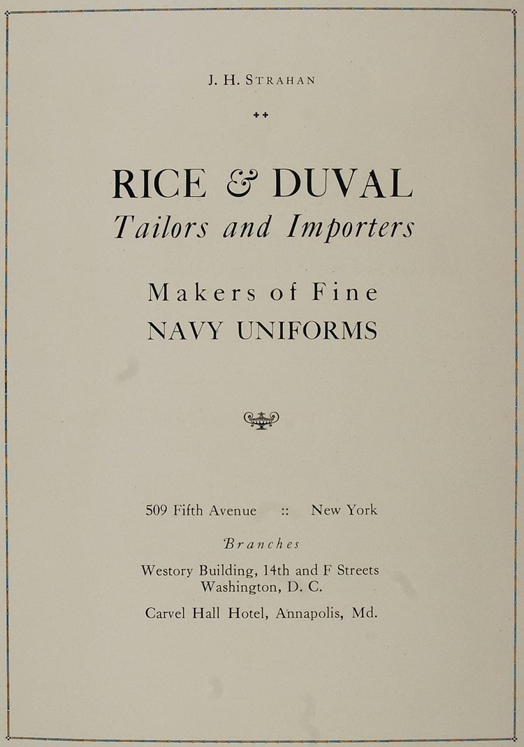 This is an original 1921 black and white all-text print ad for Rice & Duval, Tailors and Importers, makers of fine Navy uniforms.