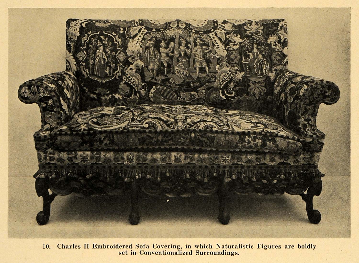 This is an original 1921 halftone print featuring a sofa with a Charles II embroidered sofa upholstery covering.