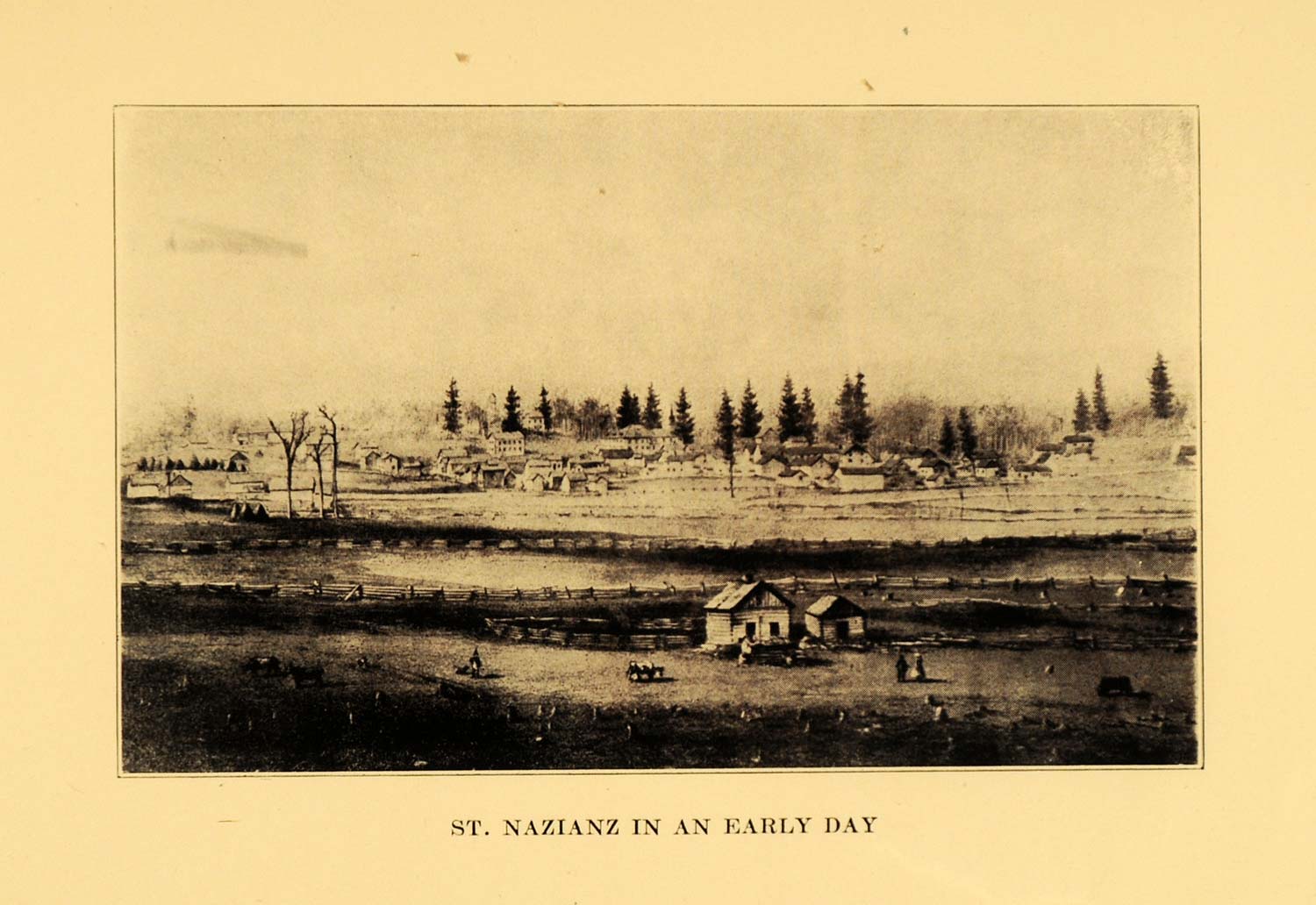 This is an original 1921 halftone print featuring an early photograph of the village of St. Nazianz, Manitowoc County, Wisconsin.