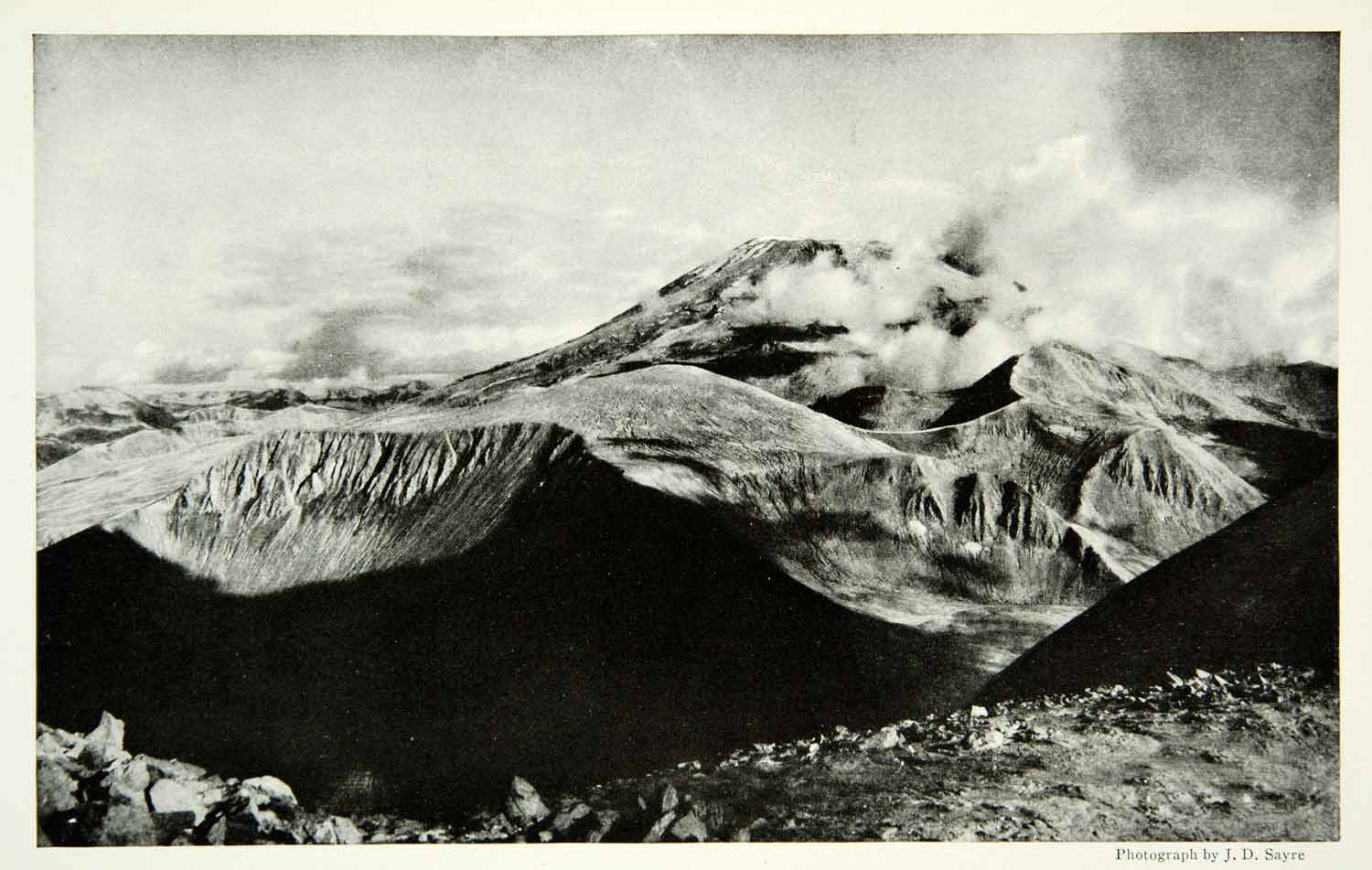 This is an original 1921 black and white halftone print of the Knife Volcano in the Valley of Ten Thousand Smokes in the Katmai region of Alaska.