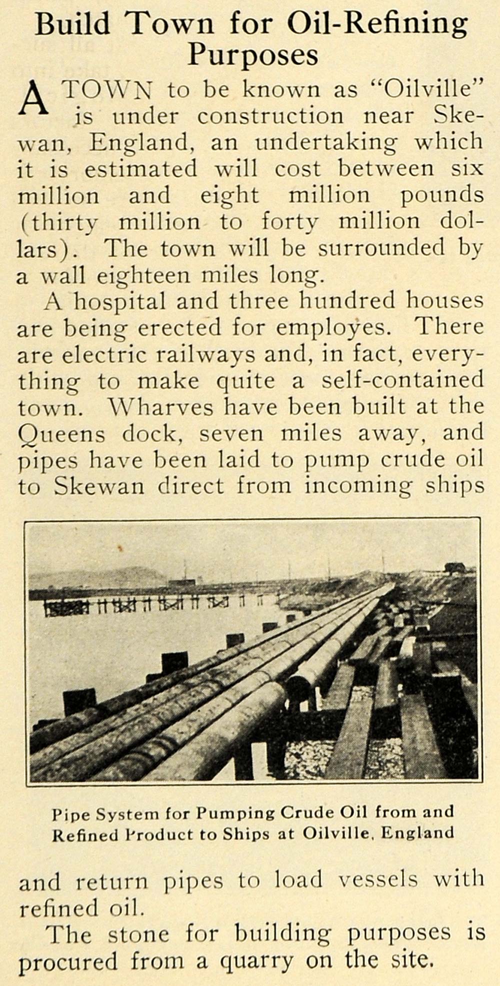 This is an original 1921 halftone print of a pipe system for crude oil transportation in Oilville, England. The article writes, "A town to be known as Oilville is under construction near Skewan, England, an undertaking with it is estimated will cost between six million and eight million pounds (thirty million to forty million dollars). The town will be surrounded by a wall eighteen miles long." It is uncertain whether or not the town was ever realized.