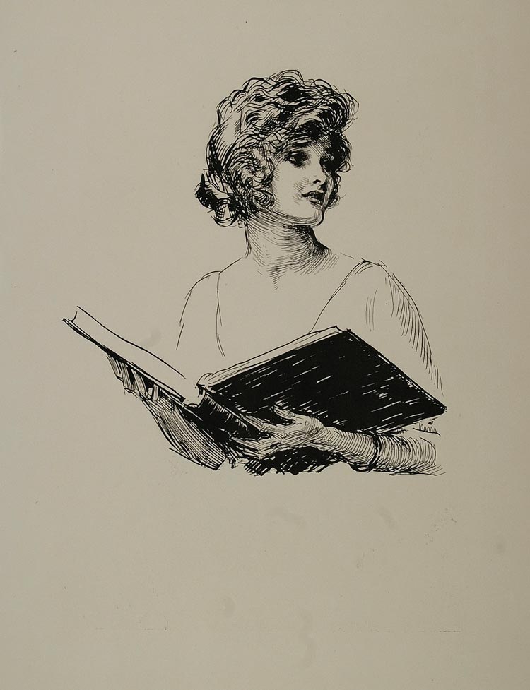 This is an original 1921 black and white sketch of a young lady with an open book.