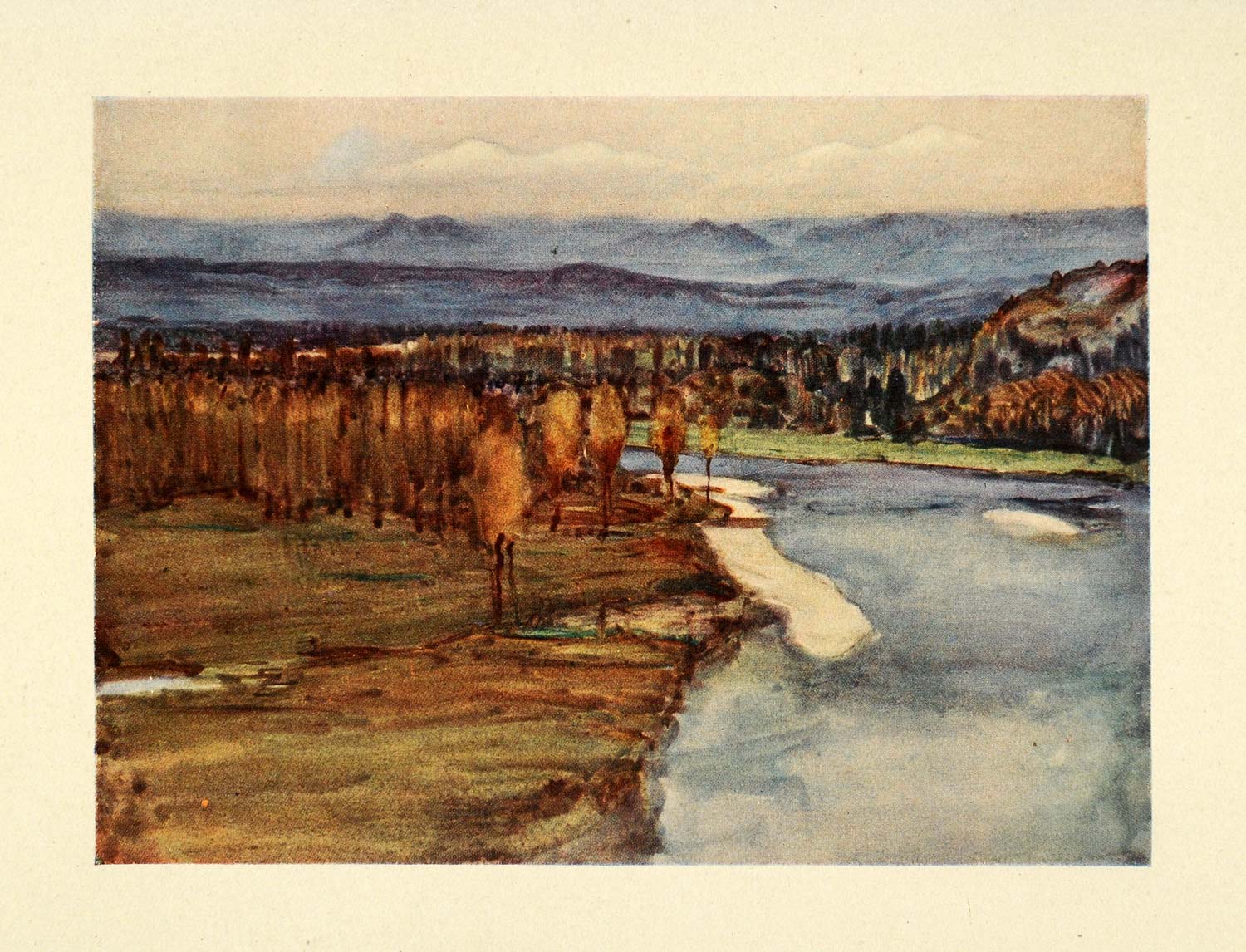 This is an original 1921 color print titled, "View from the Terrace at Pau." Pau is located in the Pyrénées-Atlantiques department of France (Republique Française).