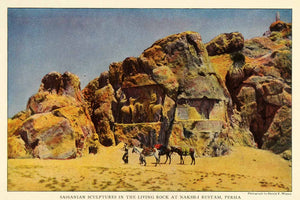 This is an original 1921 color print of Sassanian sculptures in the Living rock at Naksh-I Rustam, Persia. These sculptures are carved from rock cliffs near the tombs of the Achaemenian Kings.