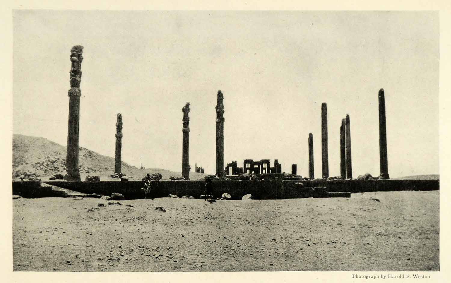 This is an original 1921 halftone print of fluted shafts making the aisles of Xerxes' audience hall at Persepholis, where levees were held within it at one time.