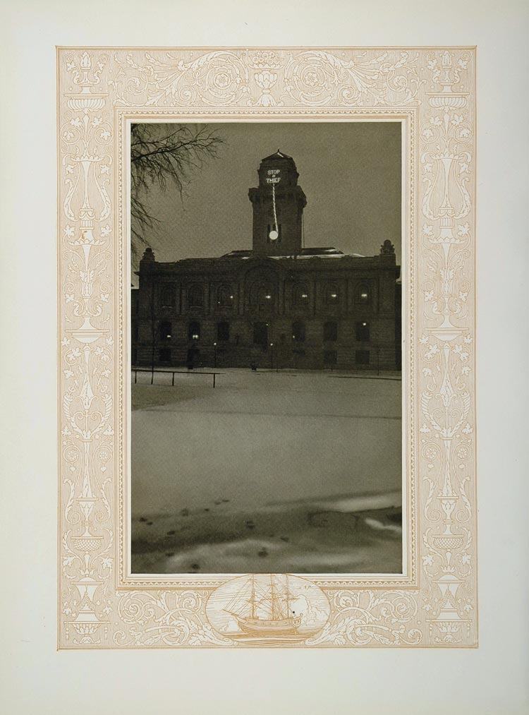 This is an original 1921 photogravure of a building at the U. S. Naval Academy framed by a border illustrated by artist Franklin Booth. Please note that there is printing on the reverse.
