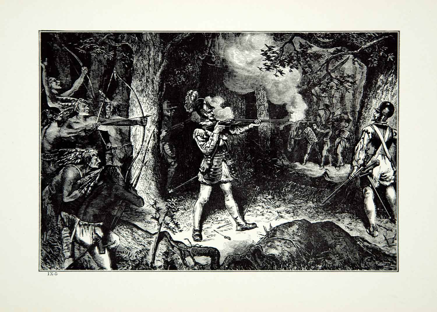 1921 Wood Engraving Samuel Champlain French Explorer Musket Shot Iroquois YWE1