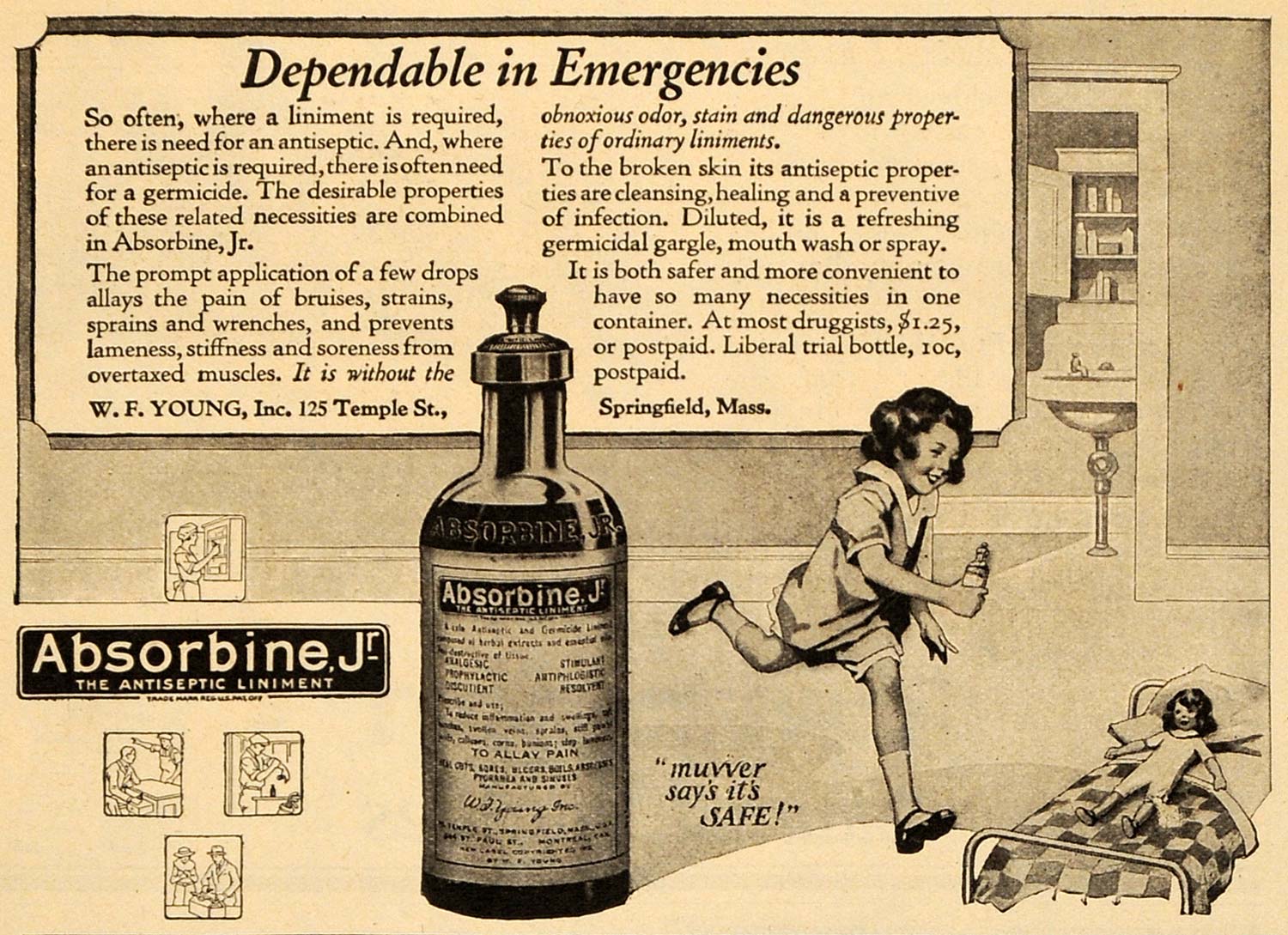 This is an original 1922 black and white print ad for Absorbine Jr. Anticeptic Liniment from the W. F. Young Inc. located in Springfield, Massachusetts.