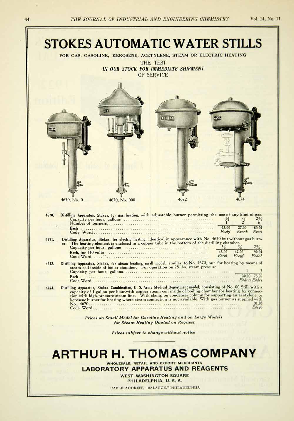This is an original 1922 black and white print ad for the Stokes automatic water distillers that were made and sold by the Arthur H. Thomas Company of West Washington Square, Philadelphia, Pennsylvania (PA).
