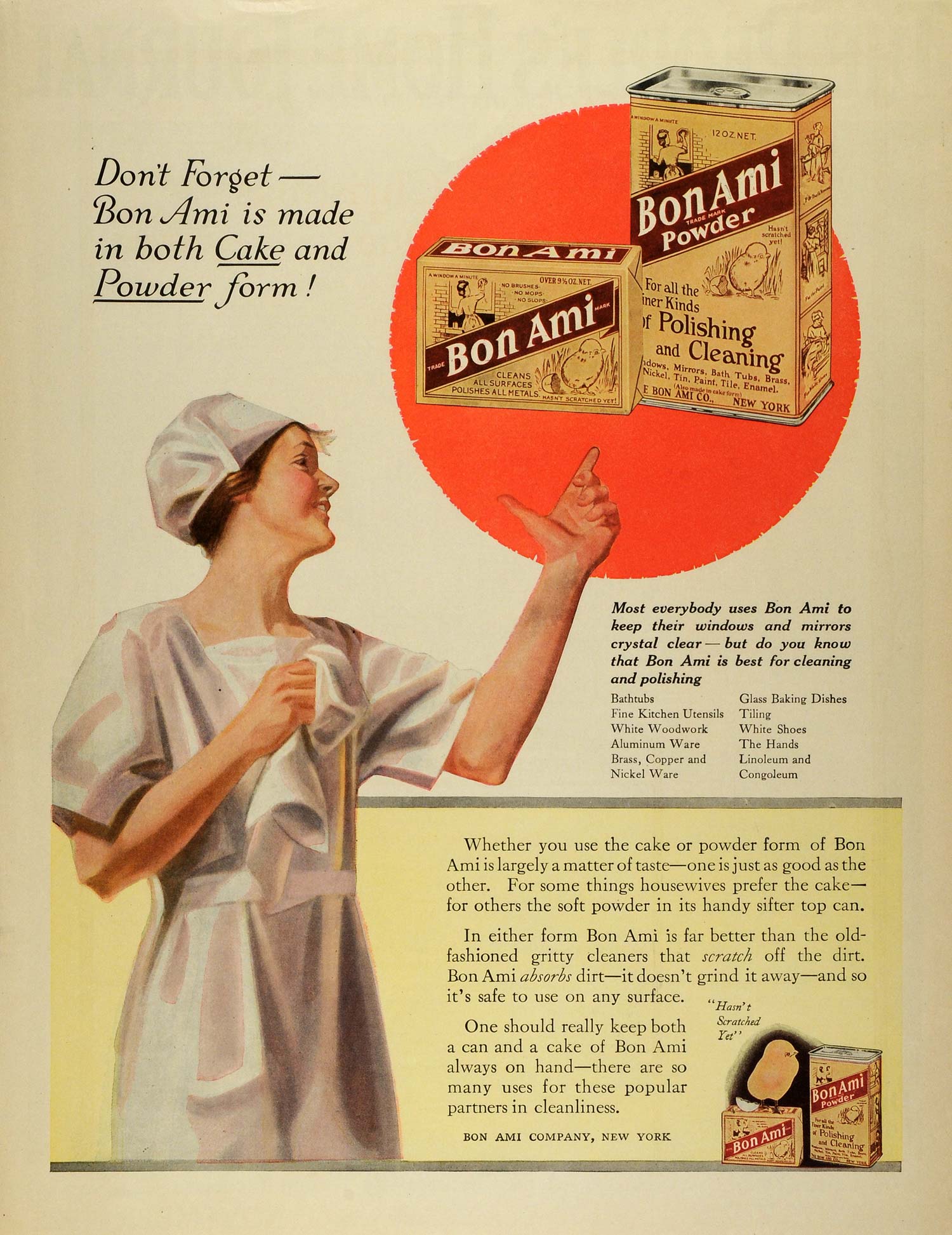 This is an original 1922 color print ad for the Bon Ami Company of New York; this ad features their Bon Ami Powders for household polishing and cleaning.