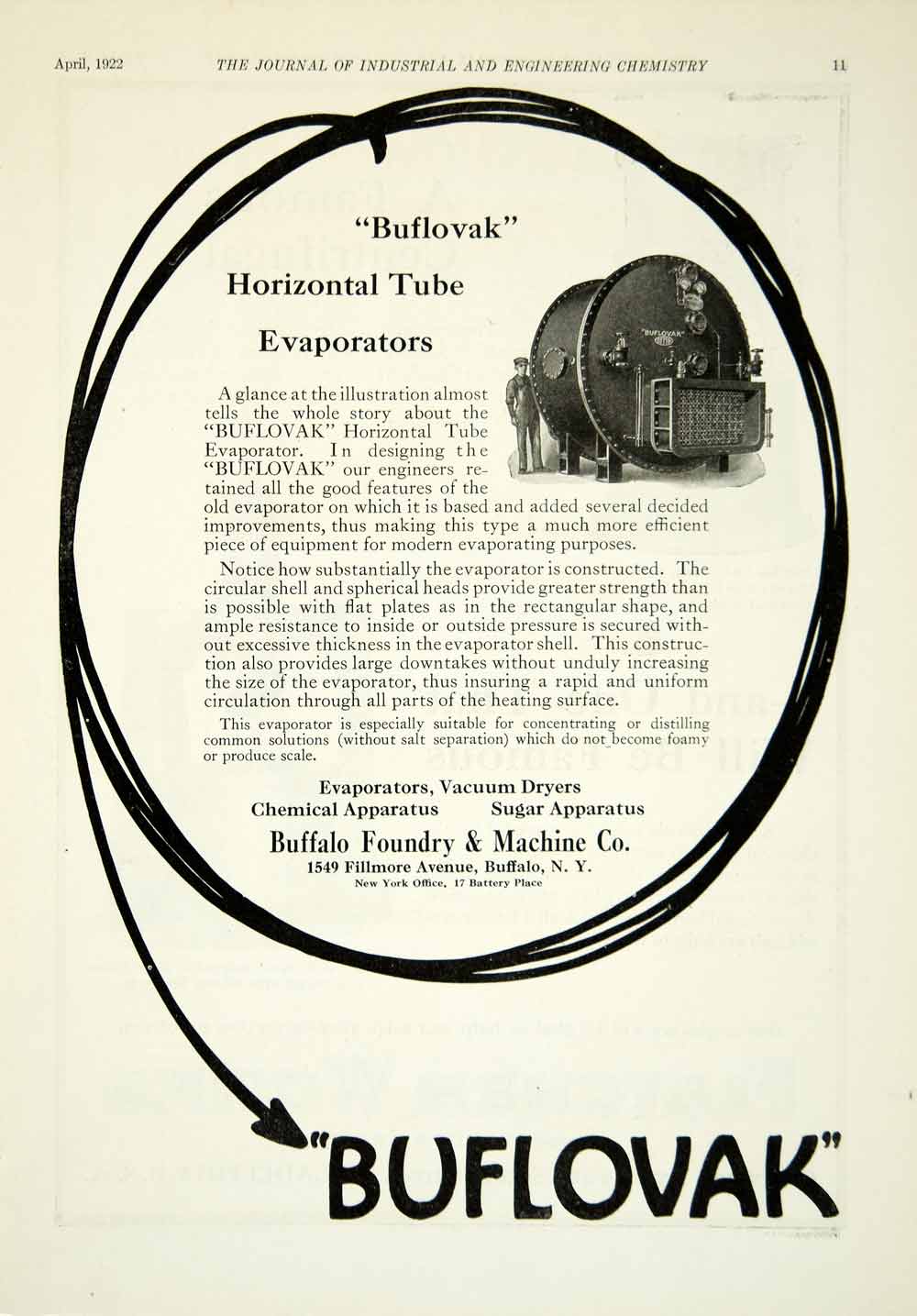 This is an original 1922 black and white print ad for the Buflovak horizontal tube evaporators that were made and sold by the Buffalo Foundry & Machine Company of 1549 Fillmore Avenue, Buffalo, New York (NY).