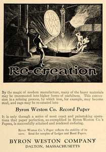This is an original 1922 black and white print ad for the Byron Weston Record Paper from Byron Weston Co. located in Dalton, Massachusetts.