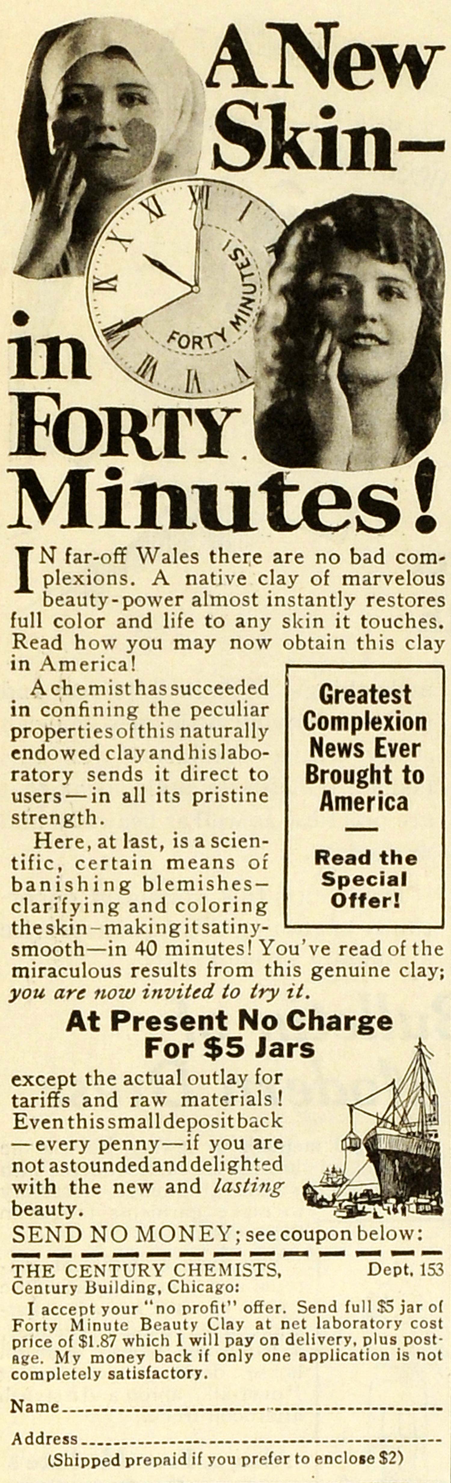 This is an original 1922 black and white print ad for the Century Chemists of the Century Building in Chicago, Illinois; this ad features their Forty Minute Beauty Clay facial skin beauty treatment.