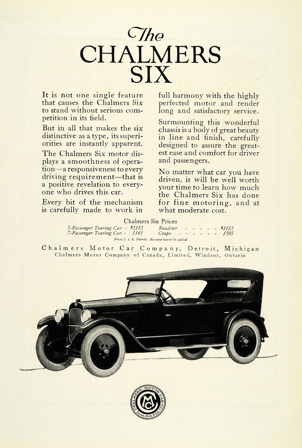This is an original 1922 black and white print ad for the Chalmers Six Automobile from Chalmers Motor Car Company located in Detroit, Michigan.