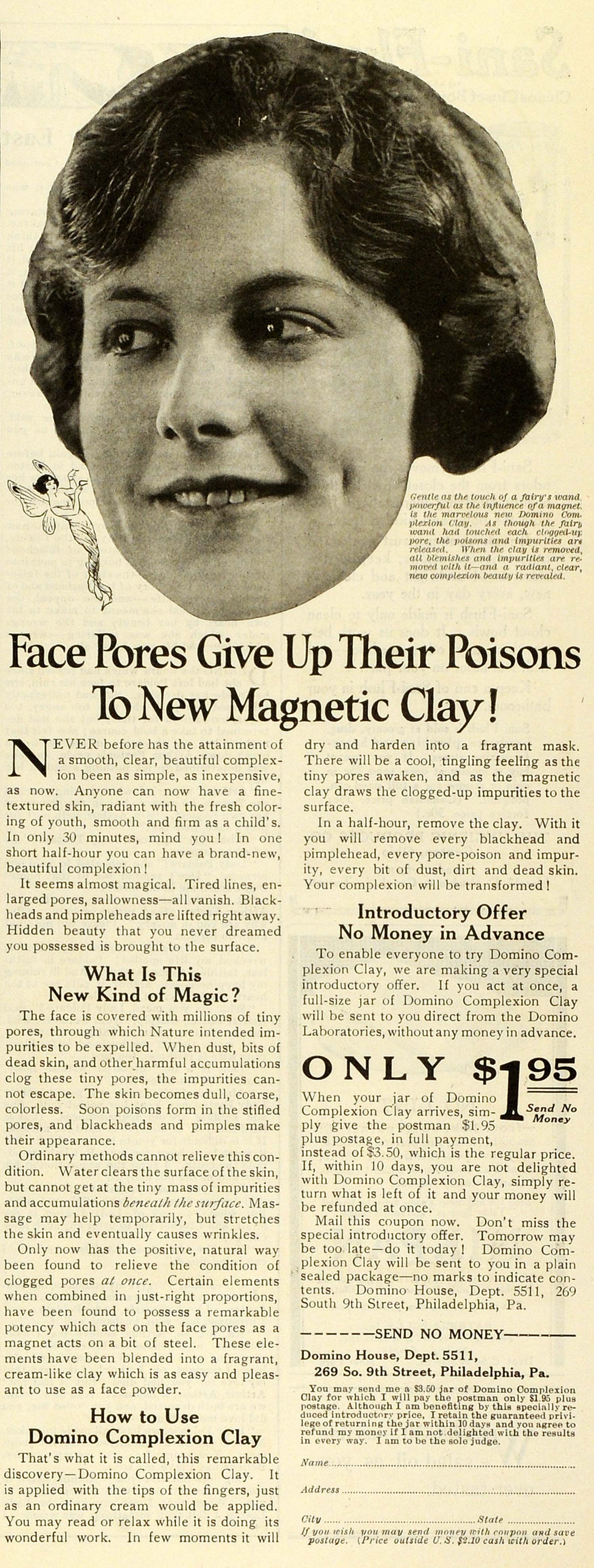 This is an original 1922 black and white print ad for the Domino House of 269 So. 9th Street in Philadelphia, Pennsylvania. This ad features their Domino Complexion Clay for facial skin beauty.