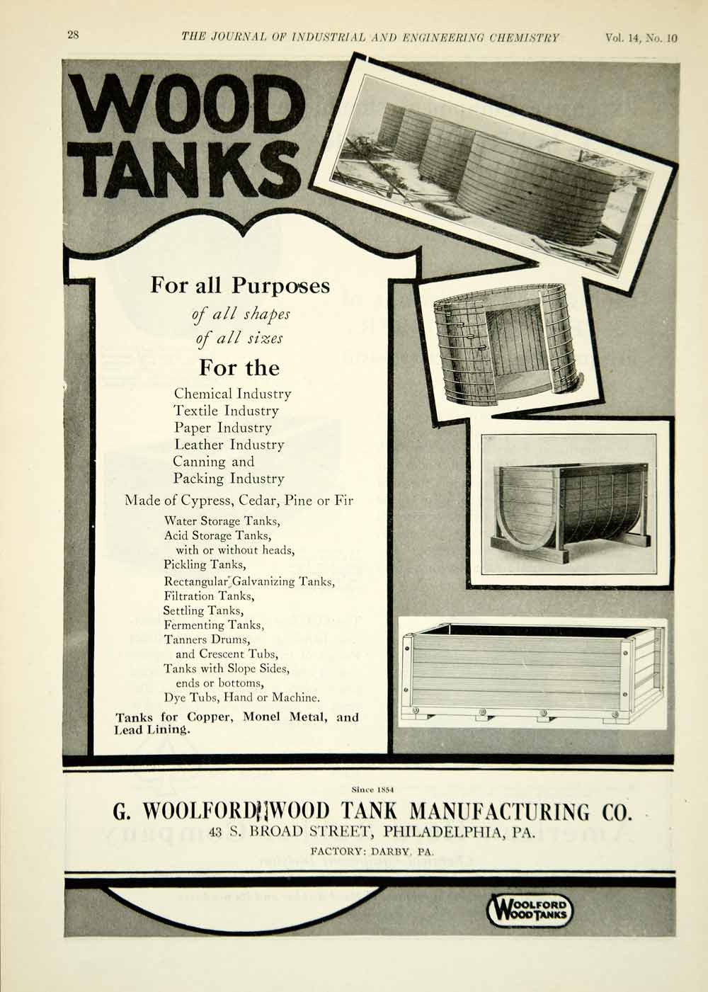 This is an original 1922 black and white print ad for wooden storage tanks that were made and sold by the G. Woolford Wood Tank Manufacturing Company of 43 South Broad Street, Philadelphia, Pennsylvania (PA).