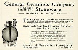 This is an original 1922 black and white print ad for the acid elevator that was made and sold by the General Ceramics Company of 50 Church Street, New York, NY.