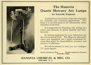 This is an original 1922 black and white print ad for the Hanovia Quartz Mercury Arc Lamps, a product by the Hanovia Chemical and Manufacturing Company in Newark, New Jersey.