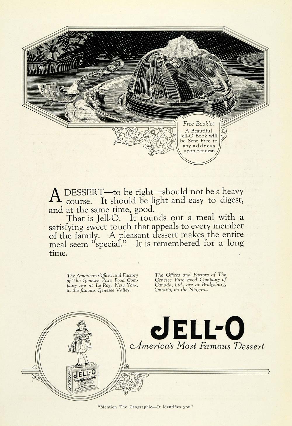 This is an original 1922 black and white print ad for the Jell-O Strawberry Gelatin from Genesse Pure Food Company located in Le Roy, New York.