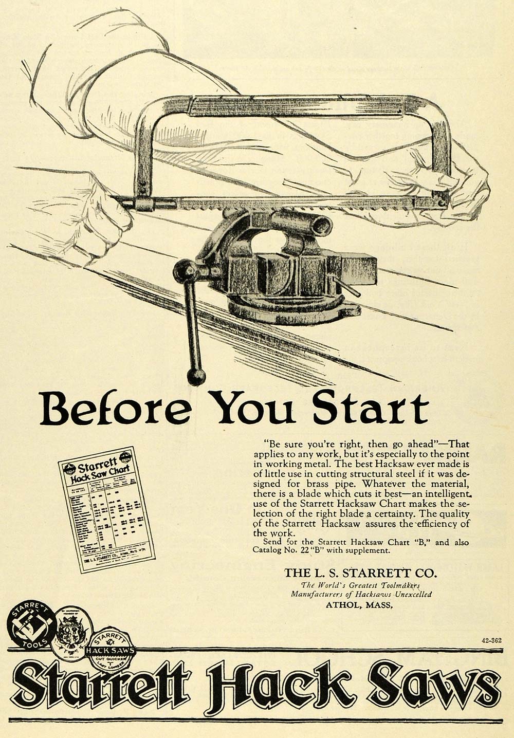 This is an original 1922 black and white print ad for Starrett Hack Saws from the L. S. Starrett Company of Athol, Massachusetts.