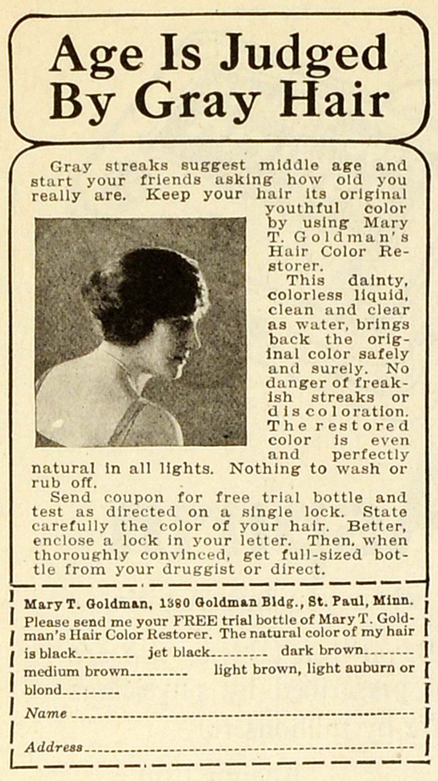 This is a small original 1922 black and white print ad for Mary T. Goldman of 1380 Goldman Building in St. Paul, Minnesota; this ad features Mary T. Goldman's Hair Color Restorer.