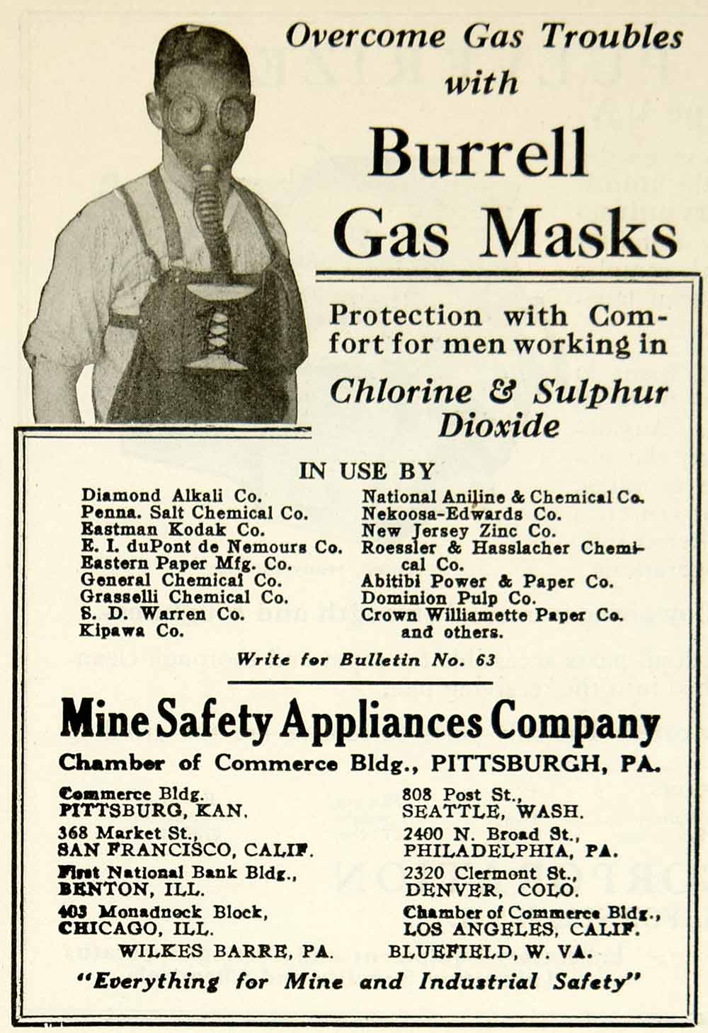 This is an original 1922 black and white print ad for Burrell gas masks for miners that were sold by the Mine Safety Appliances Company of Pittsburgh, Pennsylvania (PA).
