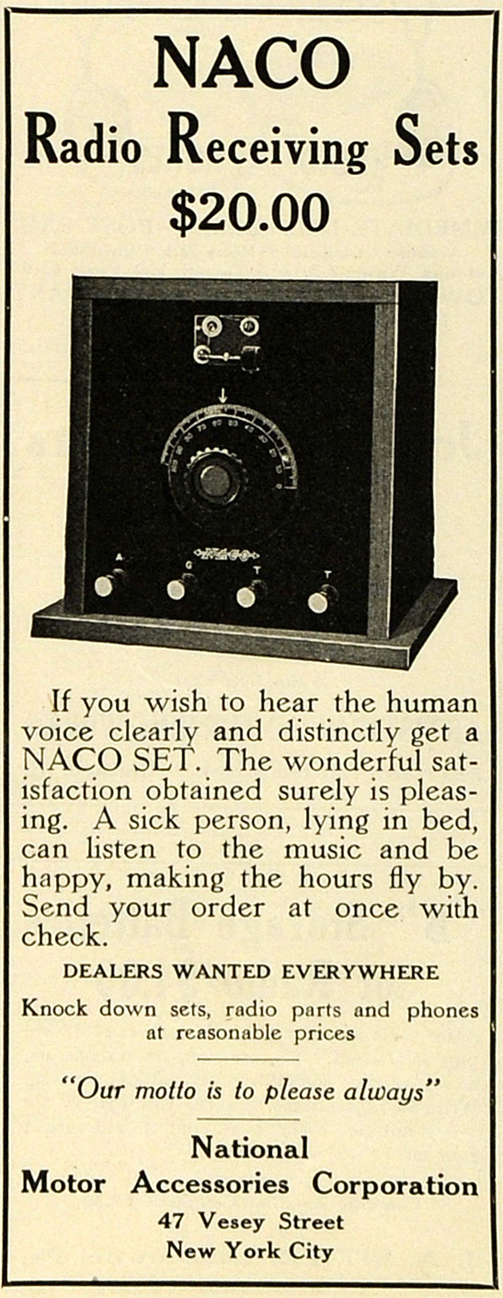 This is a small original 1922 black and white print ad for NACO Radio Receiving Sets from the National Motor Accessories Corporation of 47 Vesey Street, New York City. The caption writes, "The wonderful satisfaction obtained surely is pleasing. A sick person, lying in bed, can listen to the music and be happy, making the hours fly by..."