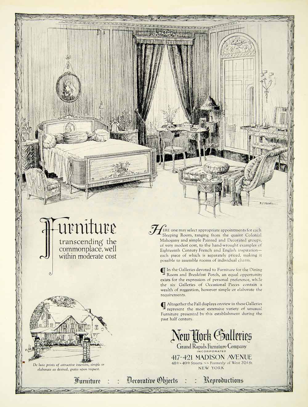 This is an original 1922 monochrome print ad for New York Galleries, part of the Grand Rapids Furniture Company Incorporated who were located at 417-421 Madison Avenue in New York.
