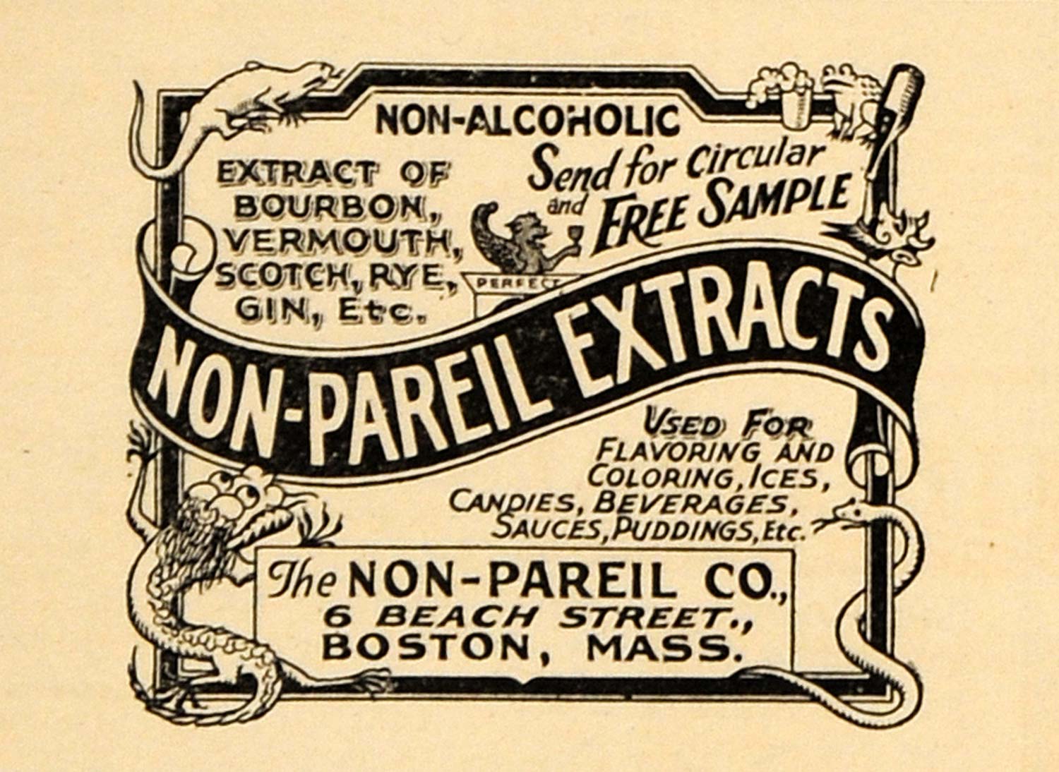 This is a small original 1922 black and white print ad for the Extract of Bourbon used for flavoring and coloring ices, candies, beverages, sauces and puddings from Non-Pareil Company, located at 6 Beach Street in Boston, Massachusetts.