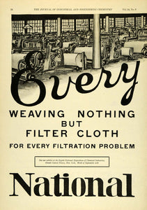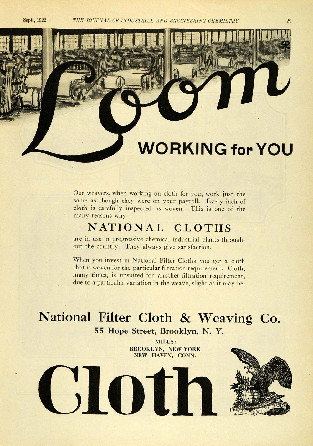 This is an original 1922 black and white two-page print ad for the National Filter Cloth and Weaving Company, located at 55 Hope Street in Brooklyn, New York. Please see additional image.