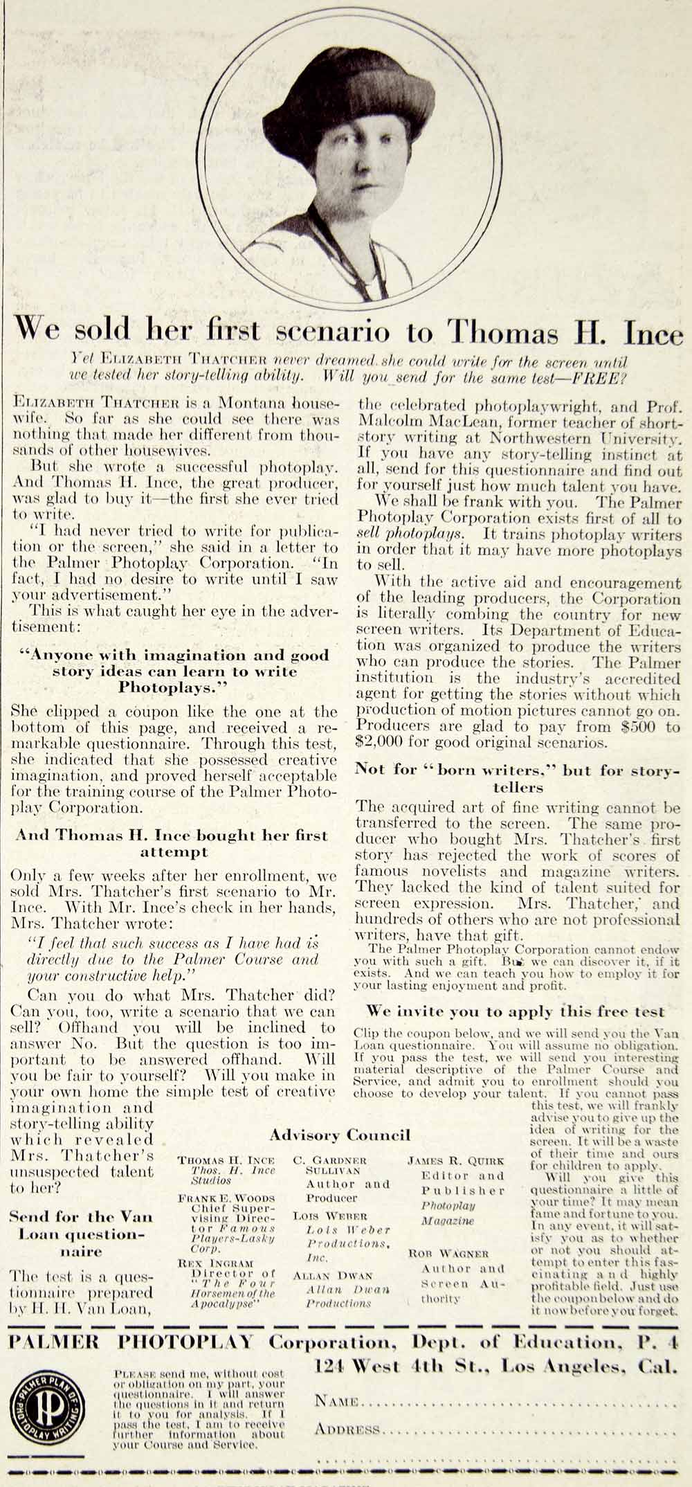 This is an original 1922 black and white print ad for the Palmer Course in screenwriting. The ad features a halftone image of Elizabeth Thatcher, a Montana housewife whose first scenario for the silent film industry was sold to Thomas H. Ince.