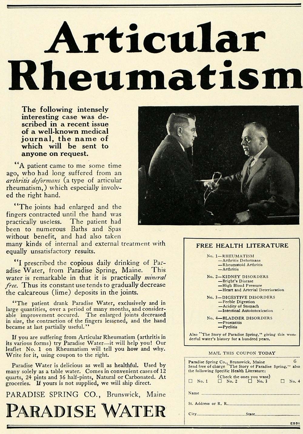 This is an original 1922 black and white print ad for the Paradise Spring Company in Brunswick, Maine, which claims to cure various types of Rheumatism, Arthritis, Kidney Disorders (Bright's Disease, High Blood Pressure, Heart and Arterial Deterioration), Digestive Disorders and Bladder Disorders (Pyelitis, Prostatitis). While the medicinal waters may have worked for some ailments, it almost certainly did not cure everything it claimed.